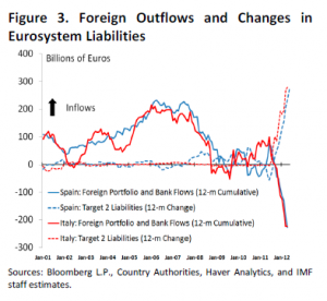 Jak pokaz skuteczności tej polityki pokaże dwa wykresy z opracować MFW sprzed kilku dni, pierwszy pokazuje ile z darmowych pieniędzy otrzymanych z banków centralnych banksterzy przekazali sektorowi prywatnemu, a drugi pokazuje porażkę tych działań, czyli masową ucieczkę kapitału z Włoch i Hiszpanii, która może wkrótce doprowadzić do bankructwa obu krajów.